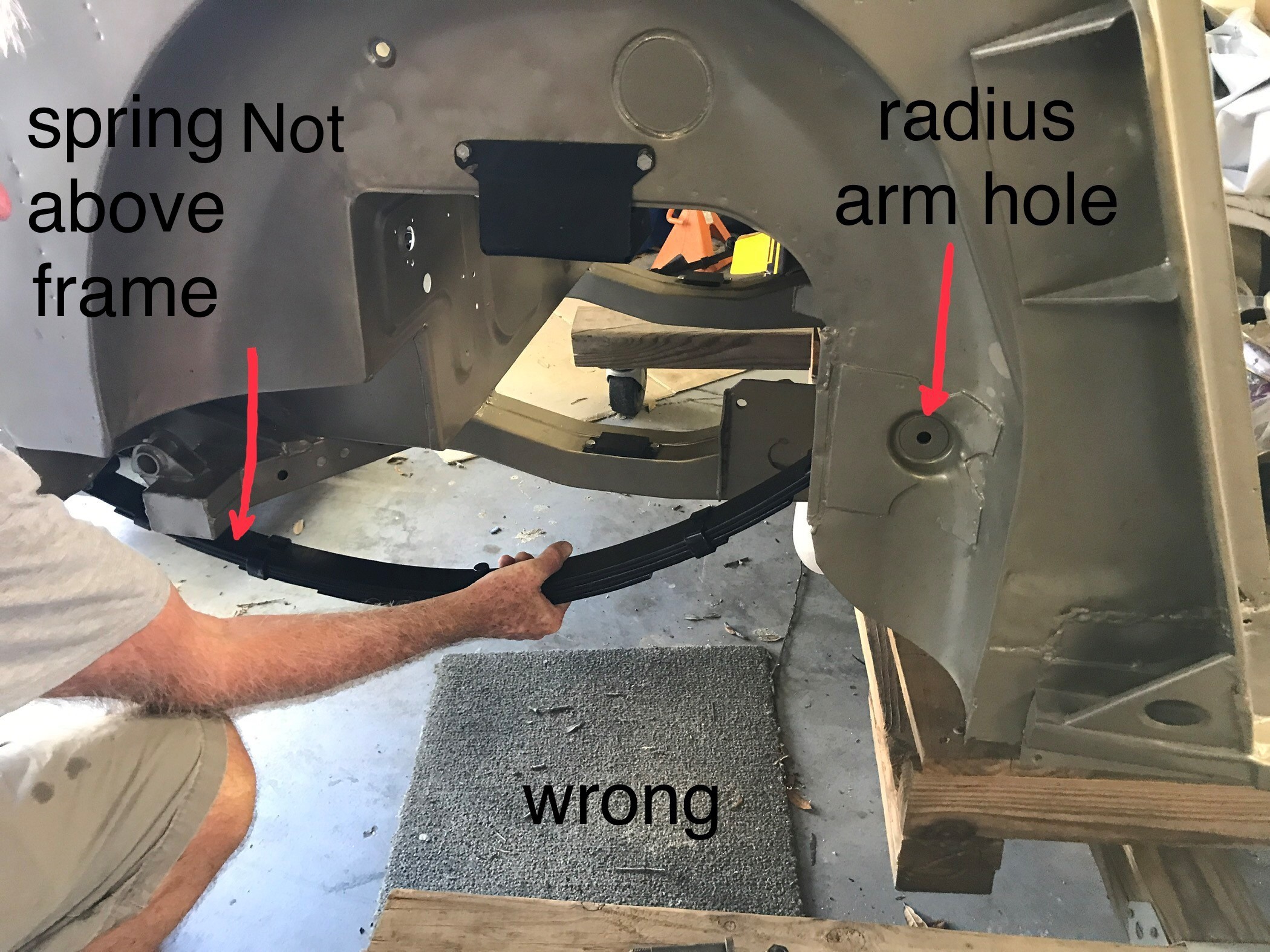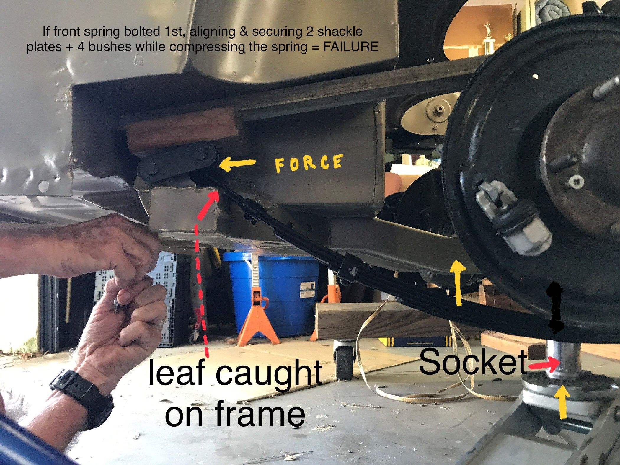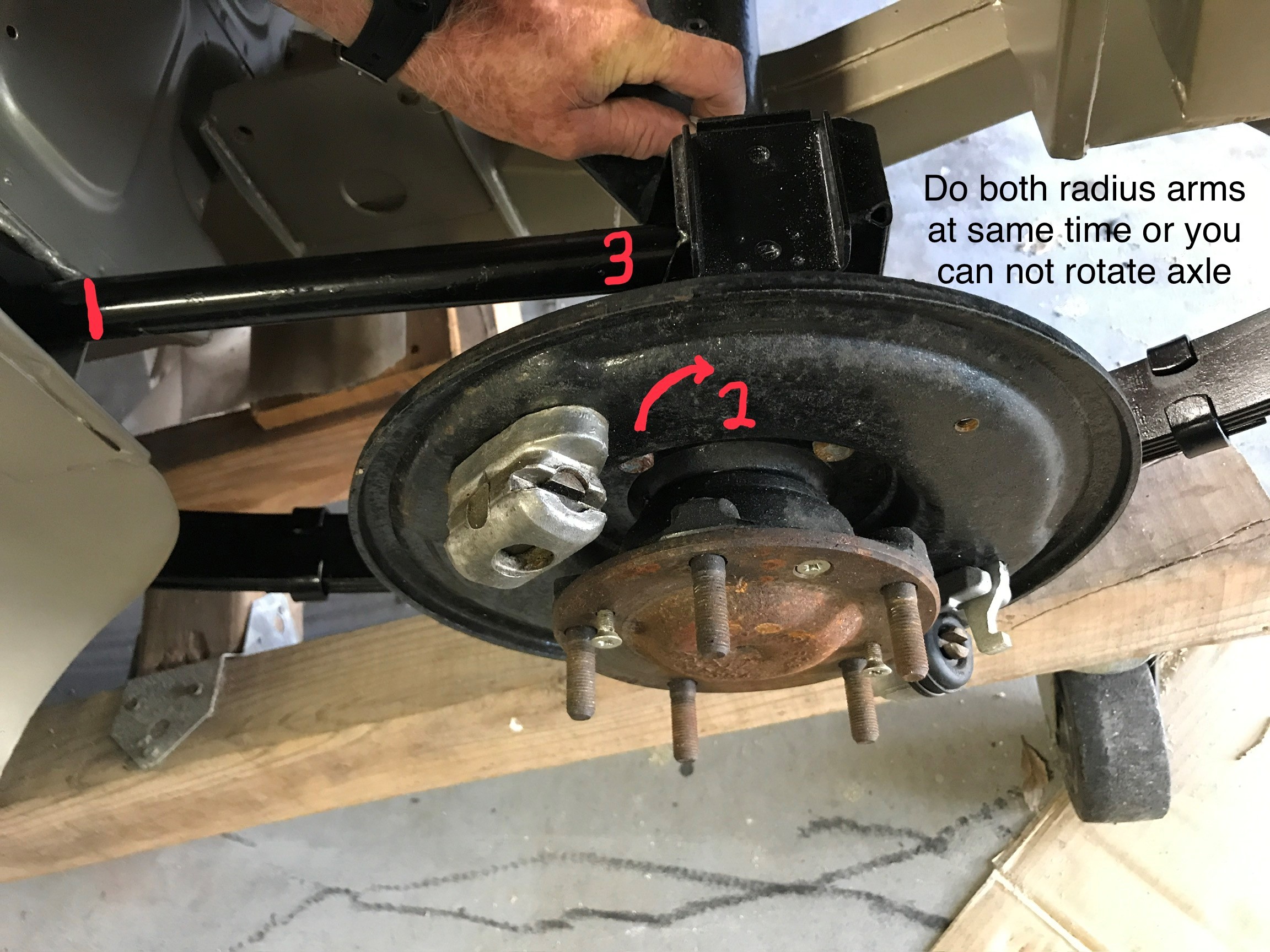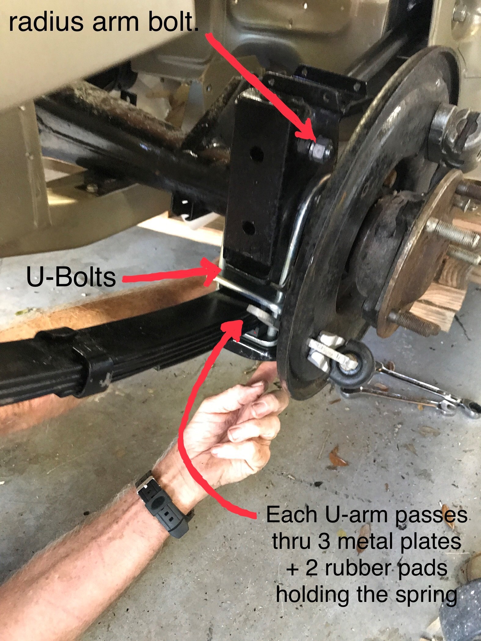 One of our members Rick Stevenson’s many projects is the restoration of a gold BJ8 he purchased in pieces. The project for this meet was to install the axle, radius arms, and rear leaf springs. Members Mike Foster and Bill Maroney spent 2 days figuring out this puzzle under Rick’s watchful eye! Everyone learned a lot! Shown below (courtesy of Bill Maroney) and a series of pictures explaining