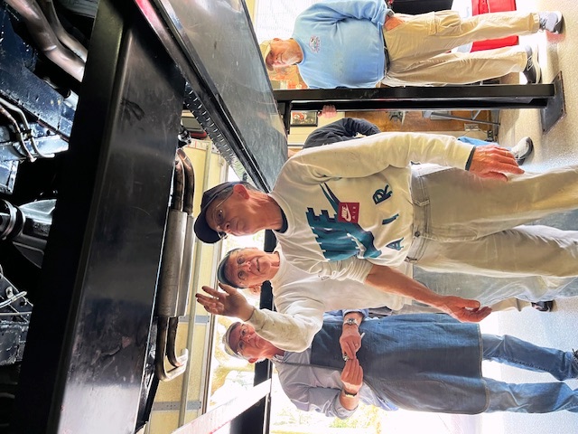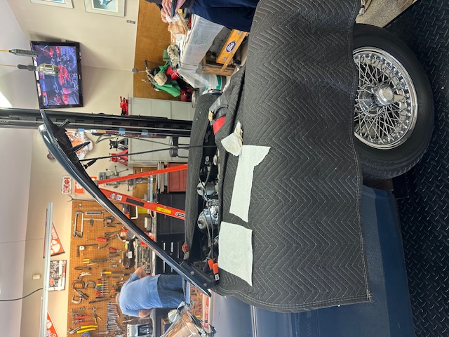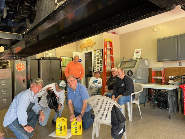 As planned, the goal was to simulate an annual Healey mechanical inspection as outlined in the published company recommendations. Ben Proctor provided the test vehicle, his recently acquired and throughly restored dark blue BJ8 (with rarely seen and very handsome dark brown leather seats and interior). With the car mounted on Paul’s lift, members took turns checking the underside and trying to trace the suspected oil leaks typical of our British-built cars.
